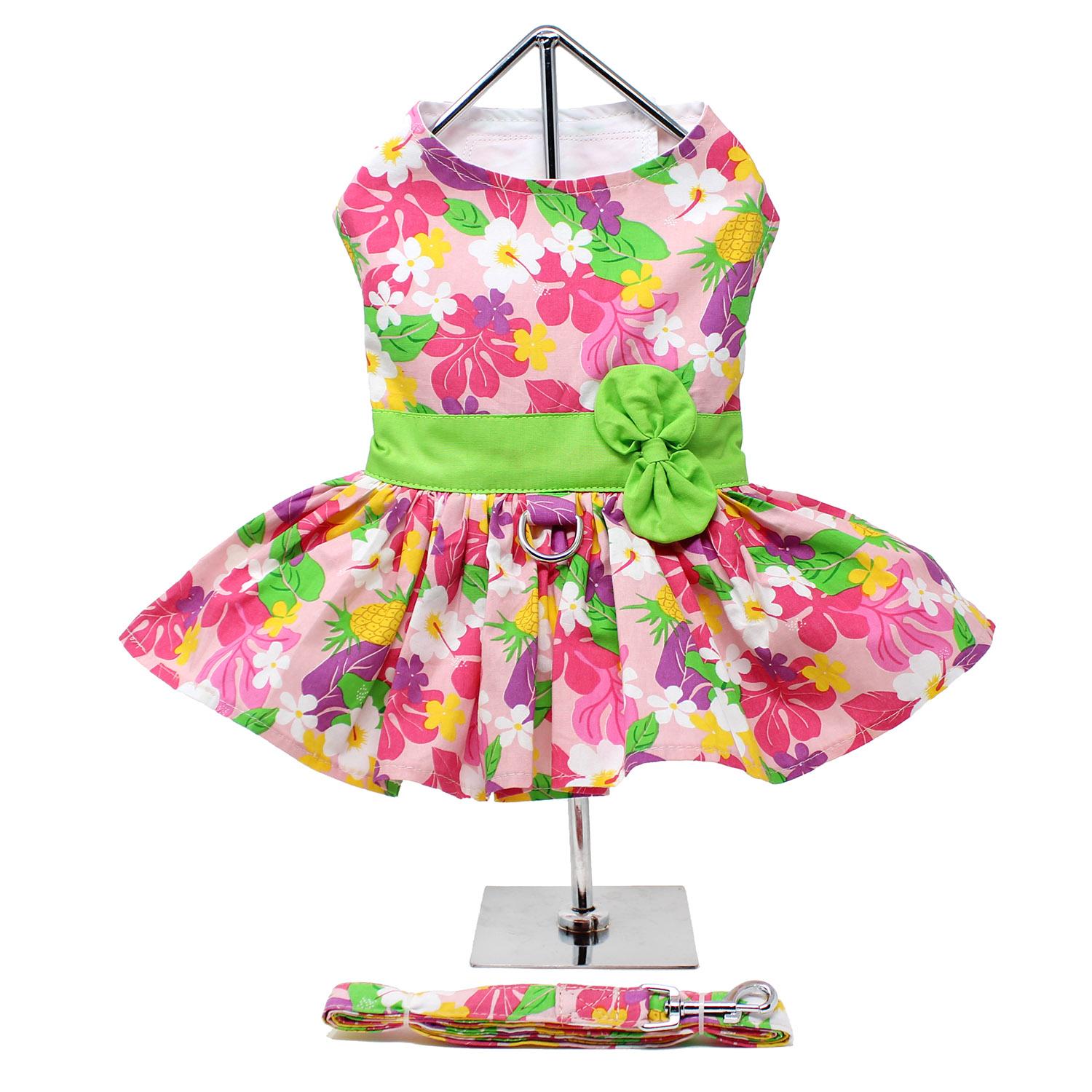 Pink Hawaiian Floral Dog Harness Dress with Matching Leash